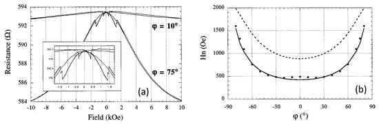 Anisotropic magnetoresistance (AMR) arising from the relativistic spin-orbit coupling is a powerful tool for studying the magnetization reversal in magnetic nanowires. AMR is related to the dependence of the resistance on the angle between the magnetization of the ferromagnet and the electrical current direction. The change in resistance between current parallel and perpendicular to magnetization is often less than a few percent. However, as a high accuracy in the electrical resistance measurement can be obtained, AMR was used to investigate the reversal of magnetization of magnetic nanowires at different temperatures [,] and quantitative analysis of the results was conducted using classical models describing magnetization reversal. The magnetoresistive curve is related to the magnetization by