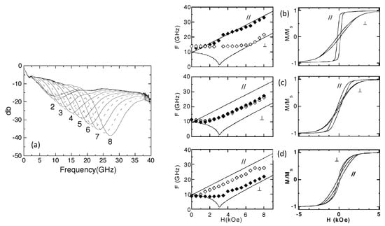 where is the resonance field and the gyromagnetic ratio provides a direct and precise quantification of the effective field . Figure 6a shows typical microwave absorption curves measured on an array of 100 nm Ni nanowires ( 27%) as a function of the intensity of the static field applied parallel to the wires []. From these results, it can be seen that the absorption curves present an intense absorption peak which varies in position and intensity as the amplitude of the magnetic field is varied. Using porous membranes, the inter-wire spacing can be controlled over a wide range. This allows to explore the properties and dipolar interactions between the wires from the limit of isolated towards the limit of almost touching wires []. In Figure 6b–d, we present the dispersion relation and the corresponding hysteresis loops, measured with the magnetic field applied parallel (closed symbols) and perpendicular to the wires (open symbols) for three different Ni samples having a diameter and packing density of (b) 180 nm and 4%, (c) 100 nm and 27% and (d) 115 nm and >35%. The data were compared to the calculated ones for isolated wires, shown as solid lines. For low packing densities, the measured resonance frequencies in the saturated states agree well with the values expected for an array of isolated wires, see Figure 6b. At higher wire density for both field directions, the measured frequencies are almost identical, as shown in Figure 6c. In addition, above a critical value of the packing (estimated around 33% for an ordered nanowire array), there is a tilt of the easy axis of magnetization between directions parallel to perpendicular to the wire axis, as shown in Figure 6d. Therefore, by increasing the density of the NW array, it is possible to modulate the effective magnetic anisotropy, from the case of isolated wires with the easy axis parallel to the wires to dense NW arrays in which the easy axis is perpendicular to the wires, passing through the particular case of quasi-isotropic magnetic systems. The observed deviations from the frequency-field dispersion curves calculated in weak field conditions are due to the fact that the system is no longer single-domain.