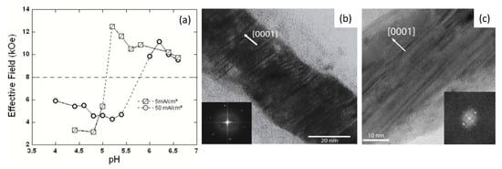 For both low and high plating currents, the overall variation of the effective field with bath acidity is similar, see Figure 7a. However, the transition between the low and high effective fields takes place around different pH values depending on the plating current density. Therefore, for a limited pH range, it is possible to selectively obtain both structural phases (c-axis parallel and perpendicular to the wires) from the same electrolyte simply by changing the plating current (or deposition rate). These results are corroborated by TEM investigations as shown in Figure 7b,c []. In the case of low current density, the TEM bright field images and corresponding diffraction patterns clearly show an orientation of the c-axis parallel to the wire axis, while, in the case of high current density, the images clearly show a perpendicular orientation of the c-axis.