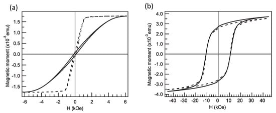 Figure 7a shows the variation of the effective field for a 30 nm Co nanowires array as a function of the pH in the range 2.0–6.6 for two different plating current densities, around 50 mA·cm and 5 mA·cm, respectively. These data were extracted from FMR experiments [,]. Let’s first consider the results obtained at 50 mA·cm. For reference, the effective field 8 kOe expected when there is no contribution from the MC anisotropy is indicated by the dotted line in Figure 7a ( 3% is for the array samples in this study). This value agrees with that of the low-pH samples, for which only the shape anisotropy and dipolar coupling should be considered due to the lack of texture in the electrodeposited Co microstructure and possible presence of fcc phase. In contrast, for pH values of 3.8–4.0, it was found that the microstructure of the deposited Co nanowires contains a dominant fraction of large hcp grains with the c-axis oriented perpendicular to the wire. A similar result was observed for all the diameters considered in the range 30–120 nm [,]. For such samples, the effective anisotropy field is weaker than for the low-pH samples due to the competition between shape anisotropy and MC anisotropy (which has an upper bound of 6.4 kOe for bulk hcp Co). Moreover, a re-orientation of the hcp c-axis along the wire axis is also observed for pH values ≥ 6.0 [], resulting in an additive MC contribution to the total anisotropy field.