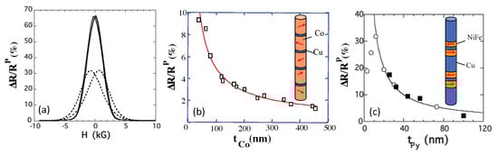 with ( and are the corresponding resistances for antiparallel and parallel arrangements, respectively), the bulk scattering spin asymmetry coefficient (), the spin diffusion length in the FM material, the thickness of the FM layers and p the proportion of antiparallel orientations of the magnetization in consecutive magnetic layers. The spin asymmetry coefficients are usually determined from analysis of the experimental results in the long SDL limit (, ). Typical values are 0.35–0.5 for Co and 0.7–0.8 for Py. Equation (4) expresses that only a depth on both sides of a magnetic layer is “active” in this limit. The variation as of Equation (4) is illustrated by the experimental results of Figure 9b for Co/Cu multilayers. Once p is determined by independent Magnetic Force Microscopy observations, the variation of Figure 9b can be used to derive the SDL length in Co, 59 nm at 77 K []. At room temperature, 40 nm. In Figure 9c, we show another example of variation of the GMR as for a collection of Py/Cu/Py trilayers []. The SDL in Py, 3.3 nm 5.3 nm, has been derived from an analysis of these data with an expression similar to Equation (4). This value is in approximate agreement with that found for planar multilayers [], 5.5 nm.