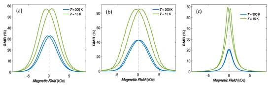 (a) CPP-GMR versus magnetic field applied in the plane of the crossed NW networks at 15 K and 300 K for (a) Co/Cu, (b) CoNi/Cu and (c) Py/Cu multilayered nanowires (adapted from [,,]). Figure adapted from ref. [] with permission of the author.