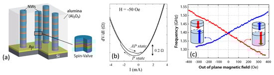 (a) illustration of the spin transfer torque device with spin valves stacked in each nanowire electrodeposited in a nanoporous alumina template; (b) differential resistance as a function of bias direct current at 50 Oe for a Py(30 nm)/Cu(10 nm)/Py(6 nm) spin valve nanowire with the magnetic field in the plane of the layer. Arrows mark the scan direction; (c) evolution of the emitted signal frequency by injecting a positive dc current of 6.0 mA as a function of the perpendicular applied magnetic field for the two magnetization configurations (in blue) and (in red) (adapted from [,]). Figure adapted from ref. [] with permission of the author.