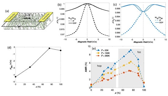 Therefore, the magnetic anisotropy in OOP of Ni-rich networks is higher than that of Co-rich ones, as expected. Figure 12d shows the MC field as a function of the Ni content (x), obtained by FMR measurements on several NiCo CNW networks. As expected, is negative and increases toward the observed limiting value for pure Co networks with perpendicular c-axis as the Ni content is reduced. It is worth mentioning that the small negative anisotropy contribution observed for the Ni sample could be originated by residual stresses due to the reduced diameter of the nanowires, as recently suggested []. Figure 12e shows the anisotropic magnetoresistance ratio (AMR) vs. Ni content (x) at 20, 150 and 290 K for the different NiCo CNW networks (See [,] for more details on the estimation of AMR ratio in such CNWs). The observed variation of the AMR ratio as a function of x is consistent with previous reports on electrodeposited films and metallurgically processed NiCo alloys [,,], where the maximum at x ∼ 75% for both temperature values is attributed to a magnetostriction and MC constants close to zero and to a saturation magnetization of about one Bohr magneton per atom for that particular alloy composition [].