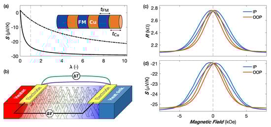 where and represent the thermopower and the thermal conductivity of the ferromagnetic material and Cu and the thickness ratio of FM and Cu layers. In metals, heat conductivity is primarily due to free electrons. Therefore, considering FM/Cu multilayers and using Wiedemann–Franz law ( where L is the Lorenz ratio), Equation (6) simply reduces to