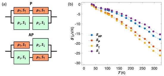 In the limit of no-spin relaxation, most of the CPP-GMR data can be understood using a simple two-current series-resistor model, in which the resistance of layers and interfaces simply add and where ’up’ and ’down’ charge carriers are propagating independently in two spin channels with large spin asymmetries of the electron’s scattering [,]. Similarly, significantly different Seebeck coefficients for spin-up and spin-down electrons, and , are expected because the d-band is exchange-split in these ferromagnets, as suggested from previous works performed on dilute magnetic alloys [,]. Assuming that the layers of the magnetic multilayers are thin compared to the spin-diffusion lengths and according to the usual rule when the currents split to flow along two parallel paths (see Figure 14a), the corresponding thermopowers and in the high- and low-resistance states, respectively, are simply given by []:
