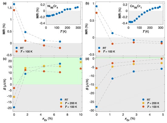 (a) anisotropic magnetoresistance and Seebeck coefficient of NiCr and CoCr CNW vs. Cr content at different temperatures. (a,b) MR ratio vs. the Cr content for NiCr (a) and CoCr (b) samples at RT (blue) and 100 K (red). The insets in (a) and (b) show the MR ratio of the NiCr and CoCr samples in function of temperature, respectively. The grey areas in (a,b) indicate negative AMR. (c,d) Seebeck coefficient vs. Cr content for NiCr (c) and CoCr (d) samples at RT (blue), 200 K (yellow) and 100 K (red) (from []). Figure adapted from ref. [] with permission of the author.
