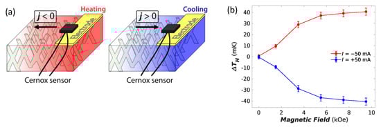 (a) schematics of a set-up for direct observation of Peltier and magneto-Peltier effects; a Cernox thermometer is used to monitor the temperature changes at the junction between the NWs and the electrode; (b) measured temperature changes at the Peltier junction in the Co/Cu CNWs (105 nm in diameter and packing density of 22%) during the magnetic field sweep for a DC current of −50 mA and +50 mA. The magneto-Peltier effect leads to heating and cooling at the saturation field depending on current flow direction (from []). figure adapted from ref. [] with permission of the author.