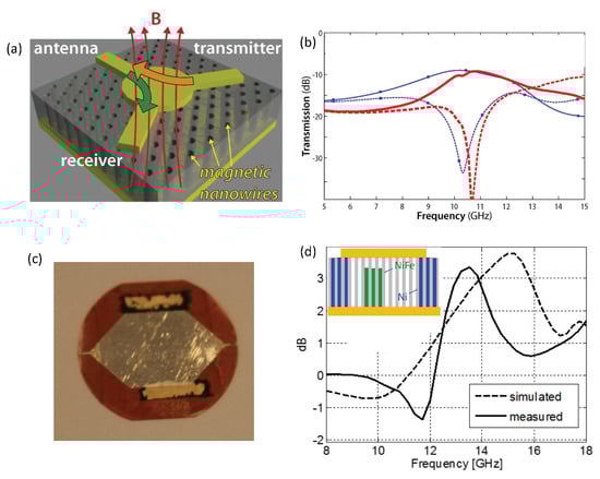 - De La Torre Medina, J.; Spiegel, J.; Darques, M.; Piraux, L.; Huynen, I. Differential phase shift in nonreciprocal microstrip lines on magnetic nanowired substrates. Appl. Phys. Lett. 2010, 96, 072508. [Google Scholar] [CrossRef]