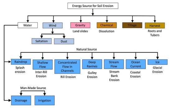 As a natural geological process, soil erosion over eons has created the world’s most fertile alluvial and aeolian (loess) soils. Acceleration of the natural erosion process by human activities, ever since the dawn of settled agriculture ~12 millennia ago, has caused the most severe environmental problems of the 21st century. Soil erosion, involving breakdown and transport of soil particles, requires energy, and a specific type of erosion depends on the source of energy (Figure 1). Water and wind are among the principal sources of energy, and thus major factors of erosion. Being a selective process, soil erosion removes and transports fine (i.e., clay and silt) and light (soil organic carbon or SOC) fractions. These three constituents (i.e., clay, silt, and SOC) are also key determinants of soil quality, and its capacity to provide numerous ecosystem services (ESs). However, these essential constituents are depleted over time in soils prone to accelerated erosion. The latter has plagued the Earth and humanity for millennia. The data based on the analysis of sediments from 600 lakes worldwide show that anthropogenic activities accelerated global soil erosion 4000 years ago []. Many once-thriving civilizations vanished because they treated their soil like dirt [,]. The current problem of accelerated soil erosion is driven by a rapid and an indiscriminate expansion of agroecosystems for feeding the growing population. Further, the problem of soil erosion is also exacerbated by anthropogenic global warming [,]. In addition to adversely impacting the wellbeing of 3.2 billion people [], accelerated soil erosion is also polluting the environment (i.e., soil, water, and air). It affects and is affected by the present and will be aggravated by the projected climate change.