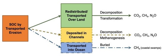 The SOC being eroded is either deposited in the landscape, in the channel, or carried into the ocean (Figure 2). Some of the SOC being transported is emitted into the atmosphere as CO2 or CH4, depending on the degree of wetness or anaerobiosis. In China, Fang et al. [] observed that 42% of the eroded SOC was redeposited within the catchment. The mean residence time (MRT) of the deposited C depends on a range of site-specific factors, and the fraction composition (labile, intermediate, passive) of the eroded SOC. Wang et al. [] reported that cumulative emission of soil CO2 decreased slightly at the erosion site but increased by 56% and 27% at the transport and depositional zones, respectively, in comparison to non-eroded sites. Wang and colleagues concluded that overall, CO2 emissions contributed 90.5% of the total erosion-induced C loss over the 4-month experiment. Whereas buried SOC at depositional sites may have a higher MRT even for the fast and intermediate turnover pools [], susceptibility to decomposition may be much higher for the labile fractions redistributed within the landscape.