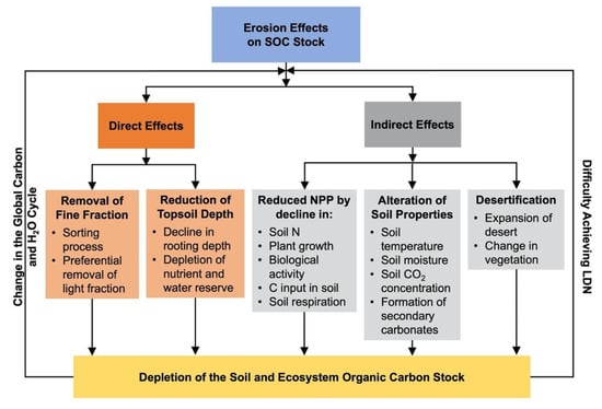 Accelerated erosion affects critical biotic and abiotic processes governing the soil/ecosystem C cycle. The magnitude of the loss of SOC by wind erosion is related to that of the fine soil fraction []. The loss of C-enriched fine soil particles depletes its SOC and reduces its future potential to restore the SOC pool. The aeolian erosion process affects both progressive and regressive pedogenesis in dry eco-regions. On agricultural lands, erosion degrades soil quality by removal of silt, clay, and SOC fractions through effective sorting processes that leave behind only coarse sand and gravels []. The loss of NPP reduces the plant feedback and aggravates the SOC loss [].