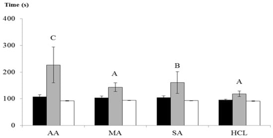 Figure 5 represents the time requested for the solutions to throw the glass capillary, which means that high values correspond to high viscosities. Figure 5 is focused on the animal chitosan behavior because this category evidenced the major variability. In all of the cases, CTSs revealed the highest density when dissolved in acetic acid.