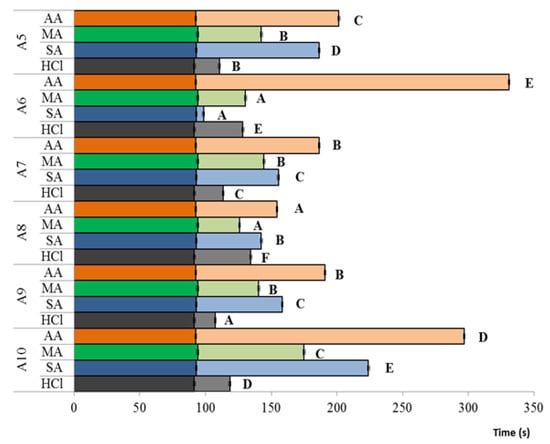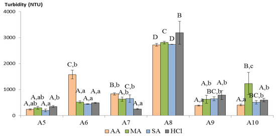 Animal chitosan allowed a greater clarification than MC at all of the time points (Figure 6). Figure 8 shows the comparison of SC behavior after 2 h of treatment because after that point the chitosan clarification rate decreased. As expressed before, in animal CTS the manufacturing process varies in several steps, such as demineralization and deproteinization, besides deacetylation. Bajaj and colleagues [] demonstrated that the alkaline deproteinization performed for 2 h could induce CTS backbone breaking even at 65 °C, or less for longer treatment, while the comparison of the deacetylations revealed a less clear effect on CTS, confirming that the “pre-treatment” participates to define CTS molecular mass. However, even in this case, no correlation between the molecular masses and the clarification capacity was evidenced. This indicates that other factors are more relevant for determining the CTS clarification property. Based on the literature, two main parameters seem to strongly affect the colloids–CTS interaction, namely the chitosan DDA and the pH of the reaction []. However, A8 demonstrated a degree of deacetylation similar to A7 (Figure 2), while its clarification power was considerably lower. Concerning pH, this factor should be excluded because the experiment was carried out at the same pH value for all of the chitosans, as only one wine was used. The shellfish chitosans comparison registered a statistically significant effect of the dissolving acid (showed in Figure 8 by different capital letters), together with a significant interaction between the sample and the acid (sample x acid, F (15, 48) = 15.092, p < 0.01). This is demonstrated by the fact that in five out of six cases (namely A5, A6, A7, A9, and A10) the dissolving acid had an effect on CTS clarifying capacity (expressed as lowercase letters in Figure 8), while this influence was not confirmed in the A8, which demonstrated a sensible reduction in clarification capability in comparison to the others. However, with the exception of A6 and A10, the degree of that effect was negligible. The nature of this interaction could probably be attributed to the specific charge distribution on the chitosan surface.