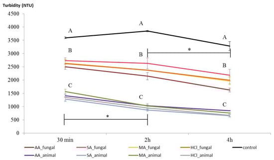 Several works explored the effects that different solvents have on chitosan properties, testing, for example, antimicrobial activities against bacteria and mold [,], CTS membrane properties and hydrophobicity [], CTS film water vapor permeability [], resistance, and elasticity []. However, no studies explored whether and how the choice of the acid used for the CTS dissolution influences wine clarification. Clarification is a process that occurs in nature and is linked to the flocculation and precipitation of suspended colloids, and chitosan is known to enhance this process by the instability generated by the interaction between colloids and NH2 residues of chitosan []. Chitosan physiochemical characteristics, such as degree of deacetylation and molecular mass, affect the clarification results []. Studied samples evidenced heterogeneities for both DDA and molecular mass, and the viscosity test indicated that dissolution acid could affect chitosan molecular conformation. Therefore, a clarification test was performed comparing fungal- and animal-derived chitosan dissolved into the four acids. Turbidity (3593 NTU at the beginning) was recorded at 30 min, 2 h, 4 h, and 24 h. After 24 h, all of the samples demonstrated a very low turbidity, on average 112 NTU in the control, that makes the comparison difficult. Therefore, that point was excluded from further considerations.