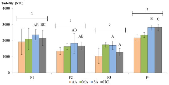 Figure 7 reports the turbidity values achieved from the samples 4 h after the treatment with MC. Statistical analyses revealed a significant difference among samples that is independent from the dissolving acid, expressed by the different numbers above the groups. In more detail, the sample outcomes depended—only in two out of four cases—on the interaction between the sample and the dissolving acid, namely when the higher ionic strength acids (SA, HCl) were used. These findings suggest that the variations depend on the mechanism of the primary amines protonation and probably on the CTS charge density []. No correlation between the calculated molecular weight and the clarification capacity was found, as the two MCs with the best clarifying capacity (F2 and F3) were those with the highest (84 kDa) and the lowest (30 kDa) molecular weight, respectively.
