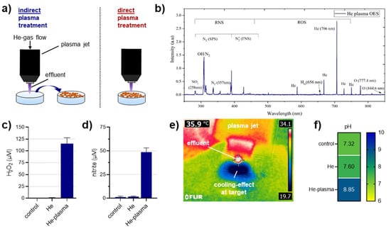 Characteristics of the gas plasma jet used in this study. (a) scheme of the indirect vs. the direct treatment regimens; (b) optical emission spectroscopy of the plasma jet; (c) hydrogen peroxide (H2O2) production of the gas plasma jet; (d) nitrite production of the gas plasma jet; (e) thermal camera image of the gas plasma jet; (f) pH of cell culture medium exposed to the gas plasma jet. Data are representative or mean and standard deviation (c,d) of three experiments.