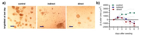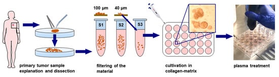 Human patient-derived breast cancer tissues were received after informed consent and processed in the laboratory (Figure 2). After dissection of the material, it was filtered to remove material larger than 100 µm followed by filtering through a 40 µm filter. The eluent of the later step including single cells and debris was discarded, and tumor microcolonies between 40–100 µm in size were mixed with collagen and added to multiwell dishes. The collagen-tumor matrix was plasma-treated directly or indirectly (Figure 3a), followed by allowing the colonies to grow through the course of incubation over several days. During this time, the colonies extended their volume due to the proliferation of individual cancer cell clones within the colonies. Non-malignant cells such as fibroblasts and immune cells of the TME do not proliferate because contact inhibition provided by the matrix inhibits their growth. Colony quantification revealed a significant decline of tumor growth in the collagen matrix for both direct and indirect plasma treatment (Figure 3b).