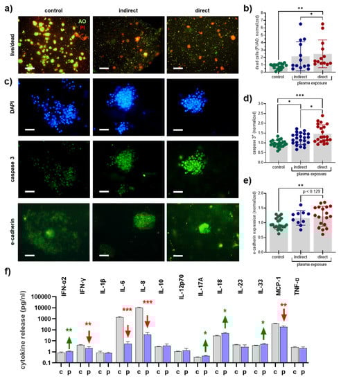 Exposure of the microtissue to helium gas alone did not give overall different results from untreated tissue in pilot experiments and hence was not included in the study. At 24 h after plasma treatment, the collagen-tumor-matrices were stained with the live/dead fluorescence dyes AO/PI (Figure 4a). Quantitative image analysis demonstrated a significantly increased presence of dead cells for both direct and indirect plasma treatment regimens (Figure 4b), showing significantly enhanced effects of the former over the latter. Next, the microtissues were fixed, and ultrathin sections were conducted. Staining was performed against active caspase or E-cadherin together with DAPI as nuclear counterstain (Figure 4c). The direct and indirect plasma treatment significantly increased the number of caspase 3-positive cells indicative of apoptosis (Figure 4d). Again, the direct treatment showed a more substantial effect compared to the indirect treatment. For the cell surface molecule E-cadherin, which is increasingly expressed in low-metastatic breast cancer tissues [], a significantly increased presence was found for direct and indirect plasma treatment. These data suggested the indirect and especially the direct plasma treatment procedure to reduce tumor colony formation, increase apoptosis and terminal cell death, and elevated the expression of a marker associated with a more epithelial phenotype. Chemokine and cytokine release is another critical effector in the tumor microenvironment (TME). To better understand the effects of direct plasma treatment on the inflammatory profile of our collagen breast cancer microtissues, supernatants were collected 24 h after plasma treatment, and 13 different cytokines and chemokines were quantitatively assessed in these samples. Significantly increased levels were found for interferon (IFN)-α2, interleukin (IL)-17A, IL18, and IL33. Despite the significant increases, the absolute changes were of these targets were modest, however. For IFN-γ, IL-6, IL-6, and MCP-1, significantly decreased levels were determined, which was especially pronounced for IL-6 and IL-8. These data suggested that direct plasma treatment reduced cell viability and the expression of several cytokines and chemokines known to modulate the inflammatory profile of the TME critically.