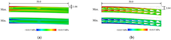 Figure 8 shows the maximum and minimum principal stress in a high-stiffness state of the four conditions. Positive values in the maximum principal stress are tensile stress, and negative values in the minimum principal stress are compressive stress. PSL-pitch showed similar distribution as the homogeneous material (Figure 8a,b). In the case of Pillars (Figure 8d), stress was concentrated on the surface of the device (Figure 8f). On the other hand, the PSL-thickness distributed the stress in the high-stiffness material (Figure 8c,e).