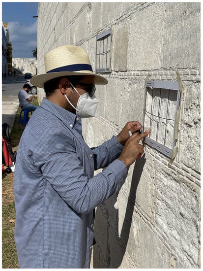One published example is that of Micallef et al. [], who effectively treated deteriorated limestone with biocalcifying B. subtilis isolated from Maltese hypogea. The treatment conferred uniform bioconsolidation to a depth of 30 mm and the treated stone had high resistance to salt deterioration and low water absorption, with a preserved pore network. Further work on this technology is still necessary. Research by one of the authors is currently underway on a limestone wall in Campeche, southern México (Figure 1). Bioconsolidation of the damaged limestone blocks is underway using a suspension of a locally isolated carbonatogenic bacterial strain applied by spraying. Frames have been set to study the efficiency of consolidation in several quadrants, to determine variability of the results. Efficiency is being measured by surface hardness and cohesion, using peeling tests. Preliminary measurements made two months after application revealed a slight increase of surface hardness and less flake detachment. The experimental study will be continued for up to one year and both short- and medium-term effects of the treatment will be determined under the natural climatic conditions of this region, classified as Köppen climate As (Tropical Savannah).