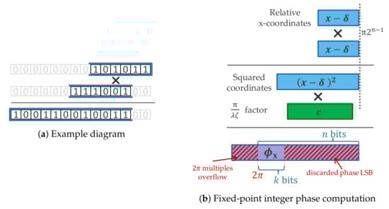 Diagram of the fixed-point integer multiplications for computing the phase. (a) Fixed-point integer multiplication diagram with example bit patterns; the boxes indicate where significant bits are found (all other bits are assumed to be 0). (b) Proposed scheme for computing phase values. The bits encode the binary digits representing the negative powers of two, multiplied by . The first multiplication squares the relative coordinates and the second multiplies it again with the c factors. The shaded red regions designate bits of , which do not have to be computed, reducing computational requirements: the least significant bits (LSB), and the overflowing multiples of , which do not alter the result of the periodic trigonometric functions.