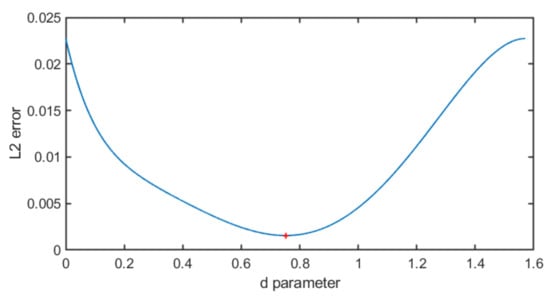 Euclidean norm of the error as a function of d. The function is convex, reaching a minimum error of at .