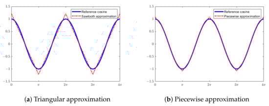 For the first approximation, we take a triangular signal with matching frequency and phase to a pure cosine. This is also known in the CGH literature as “Nishitsuji’s approximation” []. This approximation consists of linear segments, described by an absolute difference operator. This can thus be computed easily, using only a difference and a conditional sign change. Within the interval of interest , we obtain the following: