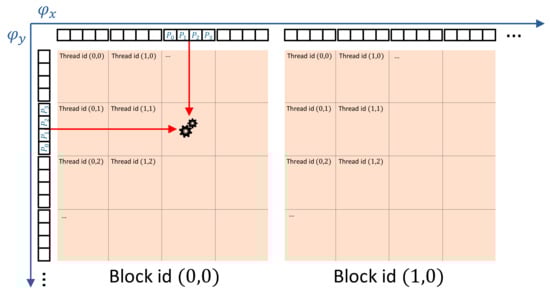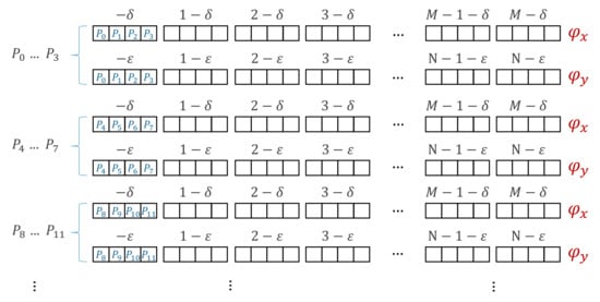 This first phase allocates one thread for every unique pixel coordinate and group of four points. Let us consider a square hologram, where ; since the GPU registers are 32-bit words, 4 bytes can be packed in a register. Therefore, every thread can compute an 8-bit phase value for (and ), packing them together for four points at a time in a single word (Figure 4). In total, we obtain threads, each computing two words of 4 phase bytes each: one for and one for .