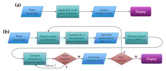 One of the most widely used algorithms are point-based CGH [,]. These decompose 3D objects into a large collection of infinitesimal self-luminous points, whose point-spread functions (PSF) are calculated and superimposed to obtain the final hologram. Thanks to the relatively simple mathematical expression of PSFs and the inherent parallelizability of the linear superpositions, they are a good candidate for massively parallel implementations on application-specific integrated circuits (ASIC) [], field-programmable gate arrays (FPGA) [,,] and graphics processing units (GPU) [,].