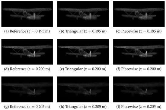 Various reconstructions of the “bi-plane” hologram, for the three algorithm versions, reconstructed at three different depths. The columns stand for the reference (a,d,g), triangular approximation (b,e,h) and piecewise approximation (c,f,i). The rows show the front (a–c), middle (d–f) and back (g–i) of the bi-plane in focus, respectively.