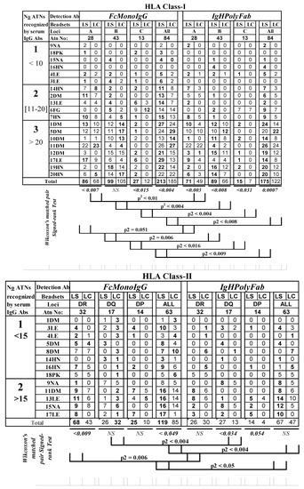 - The number of HLA-I and HLA-II alleles recognized by sera Abs is significantly higher on the LS-SAB than on LC-SAB, with both the detection Abs (numbers in bold in Figure 1);