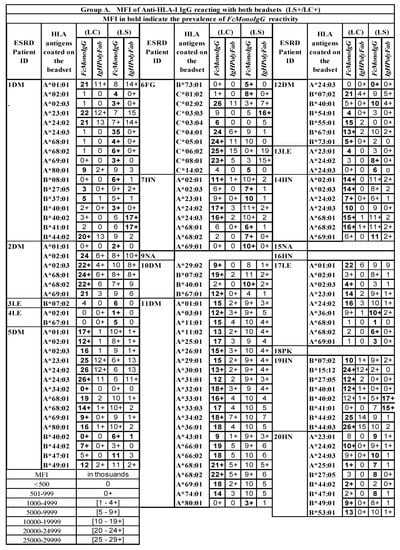 - Ravindranath, M.H.; Flippone, E.J.; Mahowald, G.; Callender, C.; Babu, A.; Saidman, S.; Ferrone, S. Significance of the intraindividual variability of HLA IgG antibodies in renal disease patients observed with different SABs monitored with two different secondary antibodies on a Luminex platform. Immunologic Res. 2018, 66, 584–604. [Google Scholar] [CrossRef] [PubMed]