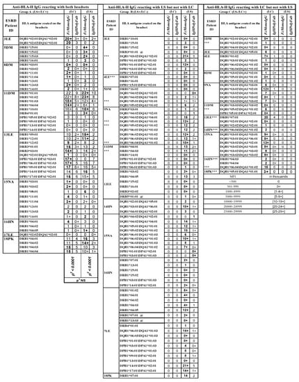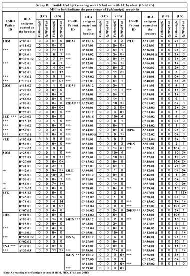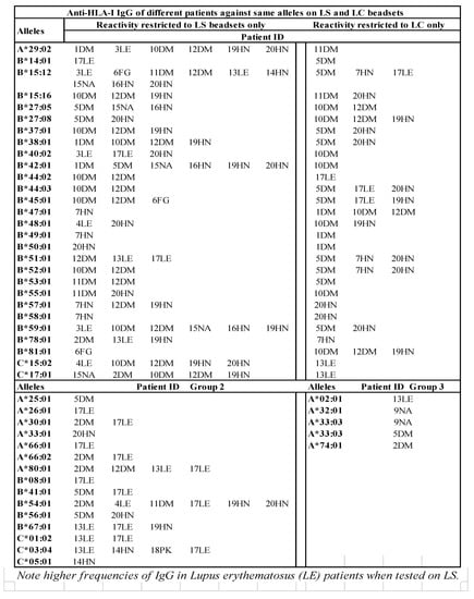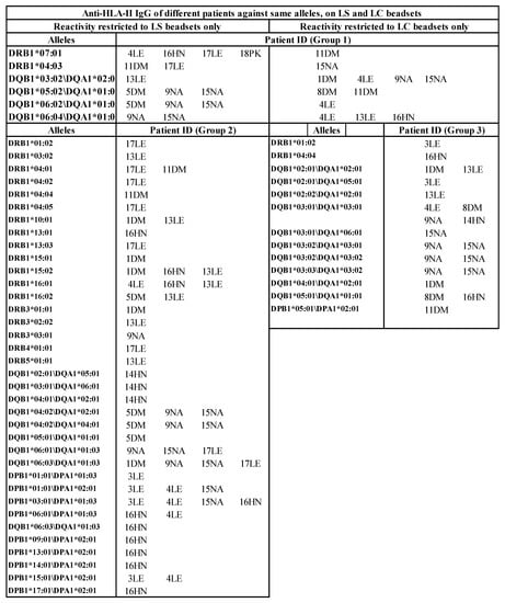 Similarly, all three groups of IgGs reacting to HLA-II alleles can be found in one patient’s serum (Figure 3). For example, the sera Abs of 11DM responded with 10 HLA-II alleles on both LS and LC (Group A), six alleles on LS only (Group B), and three alleles on LC only (Group C). In patient 13LE, the serum IgG reacted with 11 HLA-II alleles on both LS and LC (Group A), six alleles on LS only (Group B), and three alleles on LC only (Group CI).