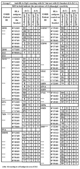 HLA antigens (HLA-I and HLA-II) recognized by the sera IgG (MFI >500) of different ESRD patients against same alleles differ between LABScreen and LIFECODES SABs. Several IgG reactivities are restricted only to LS (Group 2). Similarly, reactivities of several IgGs are restricted only to LC (Group 3).