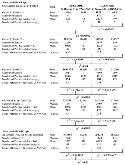 - For HLA-II antigens on LS-SABs, 12 sera tested positive. Of the 45 MFI values obtained with these sera, 43 MFIs were markedly higher with FcMonoIgG. On LC-SABs, all the 27 MFI values obtained with the nine sera were remarkably higher, only with FcMonoIgG.