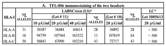 2.2.2. The HLA-I Polyreactive mAb TFL-006 as Quality Control Reagent to Monitor HLA-I OC on the SABs
