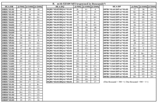 Similar findings are also observed for HLA-II. An HLA-II polyreactive mAb FJ5109 (Figure 5B) revealed the OC of HLA-II on the LS-SAB. The existence of an HLA-II OC on LS-SAB was also supported by earlier reports [,]. This study documented (Figure 5B) that the LS-SAB may carry OC of HLA-II. More in-depth studies are needed, using FJ5109 or similar mAbs, as was done for HLA-I.