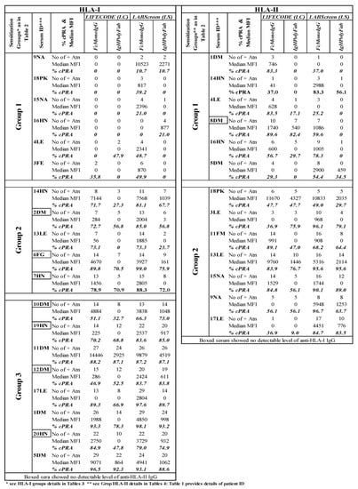 - Several sera (e.g., 3LE, 11DM, 13LE 15NA, 17LE, 18PK) anti-HLA-II Abs (Figure 3), when positive on both SABs, also showed a very high MFI with FcMonoIgG (bold values), while the reactivity with IgHPolyFab was low or negative with both LC and LS.