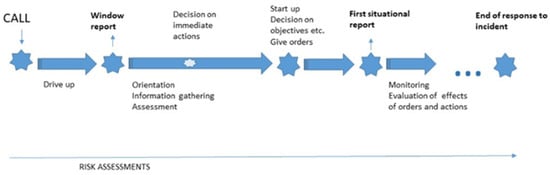 To take the role as an IC for the first level of command in a Swedish FRS, the person is required by law to have an “IC-1 course diploma” from the MSB College []. The pedagogical basis of IC education is based on reaching the third stage of Blooms taxonomy, i.e., remembering, understanding, and acting (through simulation training) []. Learning activities are organized accordingly in different learning spaces, as described in chapter 4. Procedures and actions during incident command are described in textbooks [] and curriculums of fire academies []. The most important phases, and actions (the IC is expected to perform), visualised by Wijkmark and Heldal [], are presented in Figure 1.