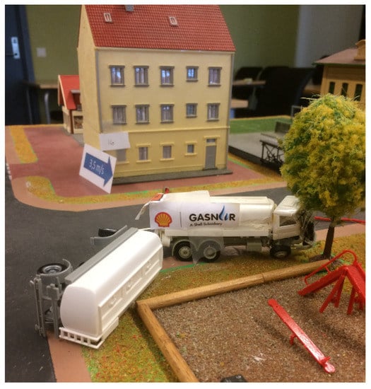 The focus of the IC-1 course is “routine incidents”, i.e., house fires and car crashes, however, the content is not static. As the number of electric drive and hybrid electric vehicles has increased, this issue is now addressed in the education []. Moreover, overturn accidents with hazardous cargo are included, as Figure 2 shows. Increased consumption of different chemicals, generating increased transport [], is a motivation for including these issues in the education.