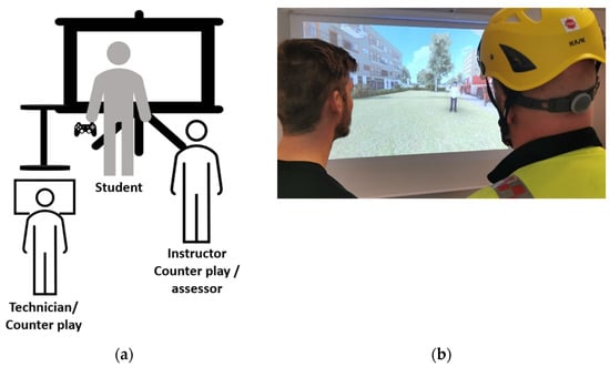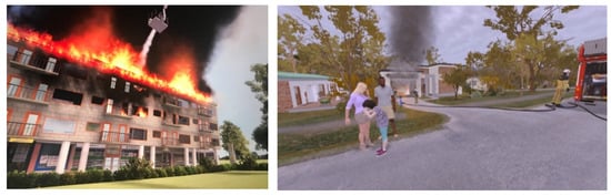On-site VS, using computer-simulated scenarios in 3D environments, has been used internationally and by MSB during recent years [,]. In VS, a student can act in the role of an IC in front of a large screen, move around in the virtual environment using a gamepad, talk to avatars (e.g., firefighters or bystanders) and make decisions on actions that are carried out in the simulated environment. In Figure 4 is an example of an apartment fire, that has spread to the roof (left) and a garage fire, while the affected family stands outside their home (to be compared to the LS settings in the previous chapter). The counterplay, i.e., the response by avatars and radio communication, is played by instructors, either in live role-play (by approaching the student) or through a speaker. Radios are used for communication as in a real incident. The setup in the room is schematically described in Figure 5a and an actual picture is shown in Figure 5b.