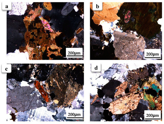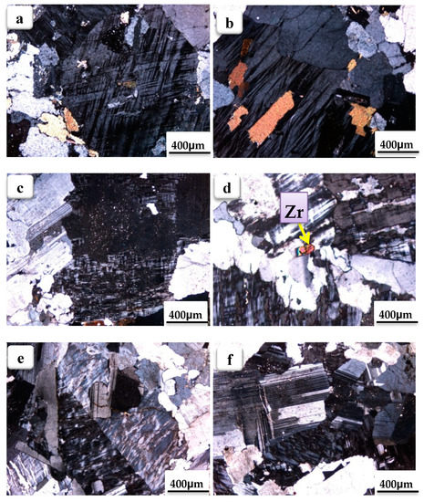 The potash feldspars are the main constituents and represented by perthite, microcline perthite, orthoclase perthite, and microcline. Perthite occurs as subhedral crystals and has both albite and pericline twinning, which form a known tartan pattern (Figure 2a). Some crystals of perthite include the second phase of biotite (Figure 2b). Microcline perthite occurs as an anhedral crystal associating plagioclase (Figure 2c) and sometimes includes crystals of zircon (Figure 2d). Orthoclase perthite occurs as euhedral to subhedral crystals showing simple twinning; sometimes, some crystals of orthoclase perthite are found enclosing the second phase of albite (Figure 2e). Exsolution textures are commonly represented by perthite and equilibrium quartz–feldspar intergrowth (i.e., myrmekite).