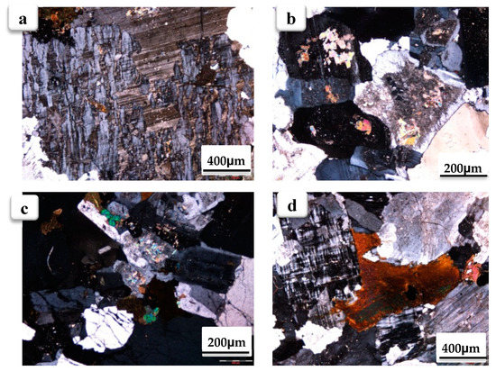 Plagioclase is represented by subhedral to euhedral prismatic crystals of variable sizes with distinct lamellar twinning (Figure 2f). Myrmekite texture is developed at the margins of plagioclase and microcline (Figure 2g). Some plagioclase crystals are oscillatory zoned (Figure 2h). It is coarse to very coarse grains which are digested and mantled by perthite (Figure 3a), referring to the mixing magma. Epidotization and muscovitization are the main alteration product of plagioclase (Figure 3b,c). The plagioclase exsolution lamellae are large enough to exhibit the characteristic polysynthetic twinning pattern (parallel stripes). In contrast, the K-feldspar host displays splendid “tartan” or “cross-hatched” twinning.