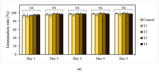Figure 1b,c presents the growth characteristics of seedlings harvested after the experiments. Seedling lengths were significantly different between the control and treatment groups (p < 0.05). The greatest seedling length (36.43 mm) was found in the control plants, and that of the treated plants ranged from 18.41 mm to 24.52 mm.