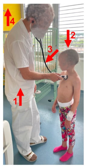 Respiratory sounds were acquired by a trained physician in performing lung auscultation (Figure 1). The auscultation was performed using a phonendoscope Littmann 3200 (3M, Maplewood, MN, USA). The phonendoscope was placed at patient’s jugulum and used in the Extended Range mode with the sampling frequency of 4000 Hz according to the Nyquist sampling theorem. The low pass filter was used to eliminate aliasing. The sound data were collected on 41 participants between 6 and 18 years old. The group of participants consisted of healthy controls and confirmed asthmatic cases of different severity. The presence and severity of bronchial obstruction was verified using spirometry. To stimulate and highlight the features in the respiratory sounds, a half of the participants (n = 24) underwent second lung sound recording after performing 15 squats. The minimum length of the records that were forwarded for the analysis was 3 complete respiratory cycles.