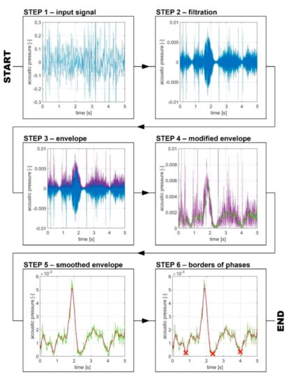 In comparison with the other studies that have targeted the detection of the respiratory phases, the presented approach of the filters and envelope provides a robust, fast and efficient approach with little computational demands. On the one hand, the approach does not require any special accessories such as additional sensors or holders [,], but on the other hand there is a requirement for an additional piece of software and lower reliability of the algorithm while the recording contains a significant amount of noise. Other authors relied on band-pass filters (150–800 Hz or 500–5000 Hz) or VAD instead of low-pass and high-pass filters or included more parameters in the analysis. Unfortunately, this often makes the algorithm more computationally expensive [,,]. This can be a very limiting factor as the examiner requires the results immediately after the examination. Recent studies have also highlighted the necessity of detecting the pauses between the inhalation and exhalation []. If such a pause existed in the recording, the presented algorithm is not able to detect such a pause and the indication line in the graph is placed in the middle of such a pause. In addition to that, the algorithm is not able to label which phase is the inhalation one and which phase is the exhalation one. Of course, there are other methods to determine the respiratory phases. For example, the methods based on the respiratory gas flow []. These methods can be very accurate but the instrumental and personal demands are considerably high.