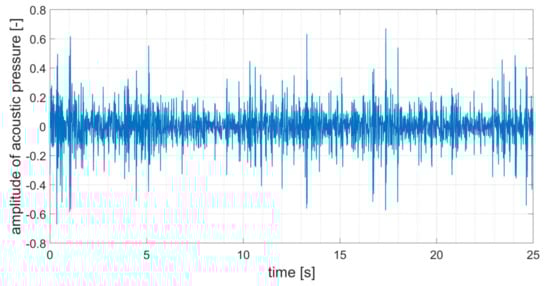 Unfiltered respiratory sound of a healthy female participant-Patient No. 1. Recorded at jugulum, age 13 years old, without bronchial obstruction. Chaotic progress of the acoustic pressure due to the noise in the sound. The phonendoscope Littmann 3200 records the amplitude of the acoustic pressure as a relative quantity normalized to maximum value 1. The amplitude of the acoustic pressure is therefore in arbitrary units.