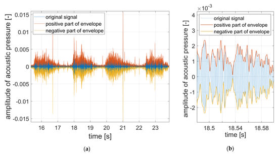 (a) Original filtered signal with positive and negative parts of the envelope; (b) detail.