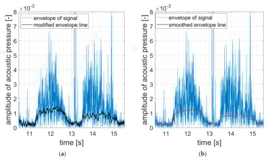 (a) Detail of modified envelope line with the elimination of the noise at the time of 13 s; (b) detail of smoothed modified envelope line.